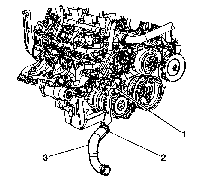 Reposition the radiator outlet hose clamp (2) from the engine (1).