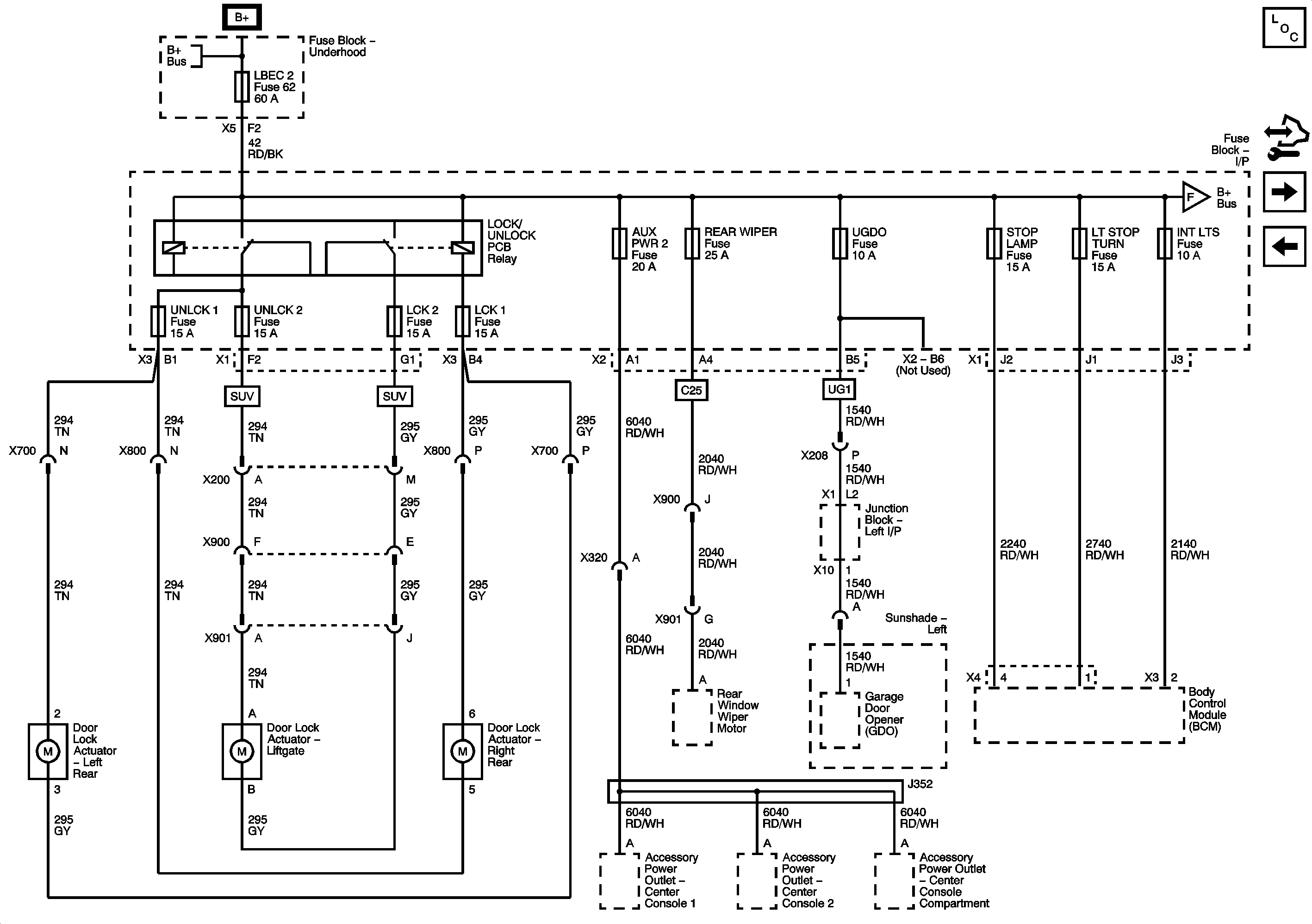 LBEC 2, AUX PWR 2, REAR WIPER, UGDO, STOP LAMP, LT STOP TURN, INT LTS Fuses and LOCK/UNLOCK PCB Relay
