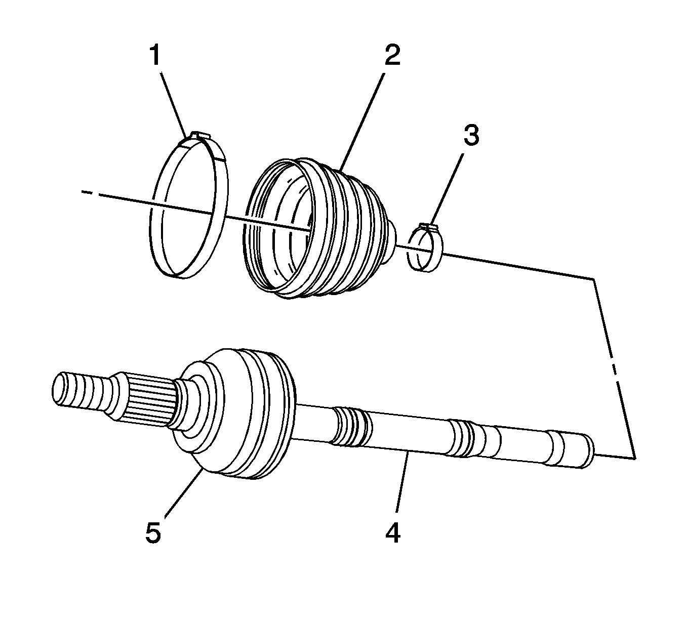 - Using a pair of side cutters, remove and discard the inner (1) and the outer (3) boot clamps from the wheel drive shaft (4) and the CV joint housing (5).