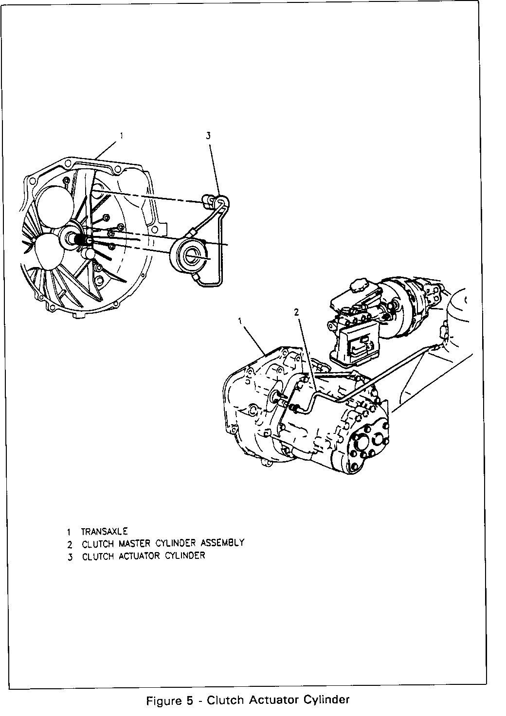 The Clutch Actuator Cylinder combines the release bearing and the actuator cylinder. Refer to Figures 3 through 5. To replace the clutch actuator cylinder, the transaxle will need to be removed.