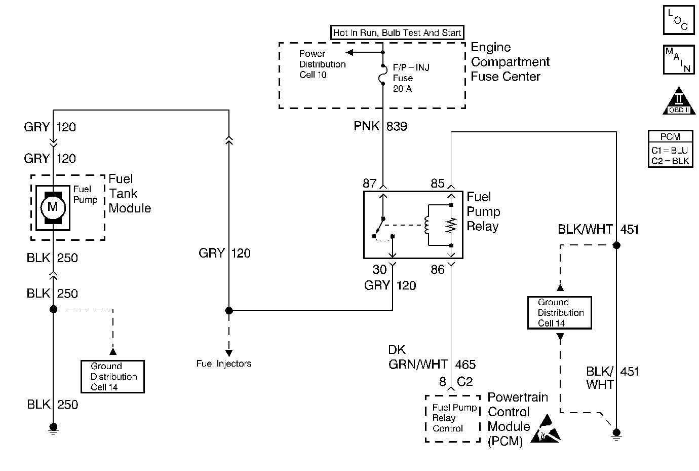 Jumpering CKT 120 to CKT 839 verifies that the fuel pump relay ignition feed circuit, the fuel pump feed circuit, the fuel pump and fuel ground are all OK.