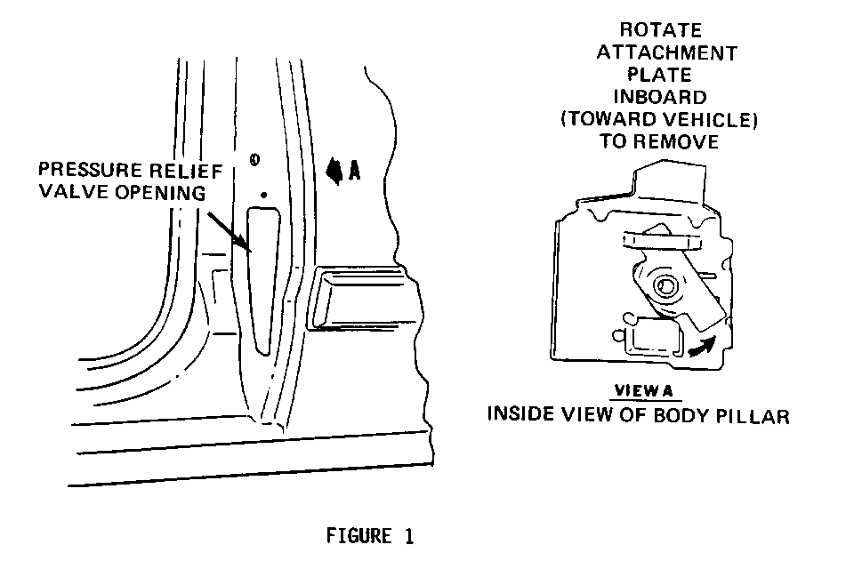 3. Reach through hole exposed by removal of pressure relief valve and remove striker bolt attachment plate by grasping plate and rotating bottom of plate inboard (toward vehicle). Refer to Figure 1.