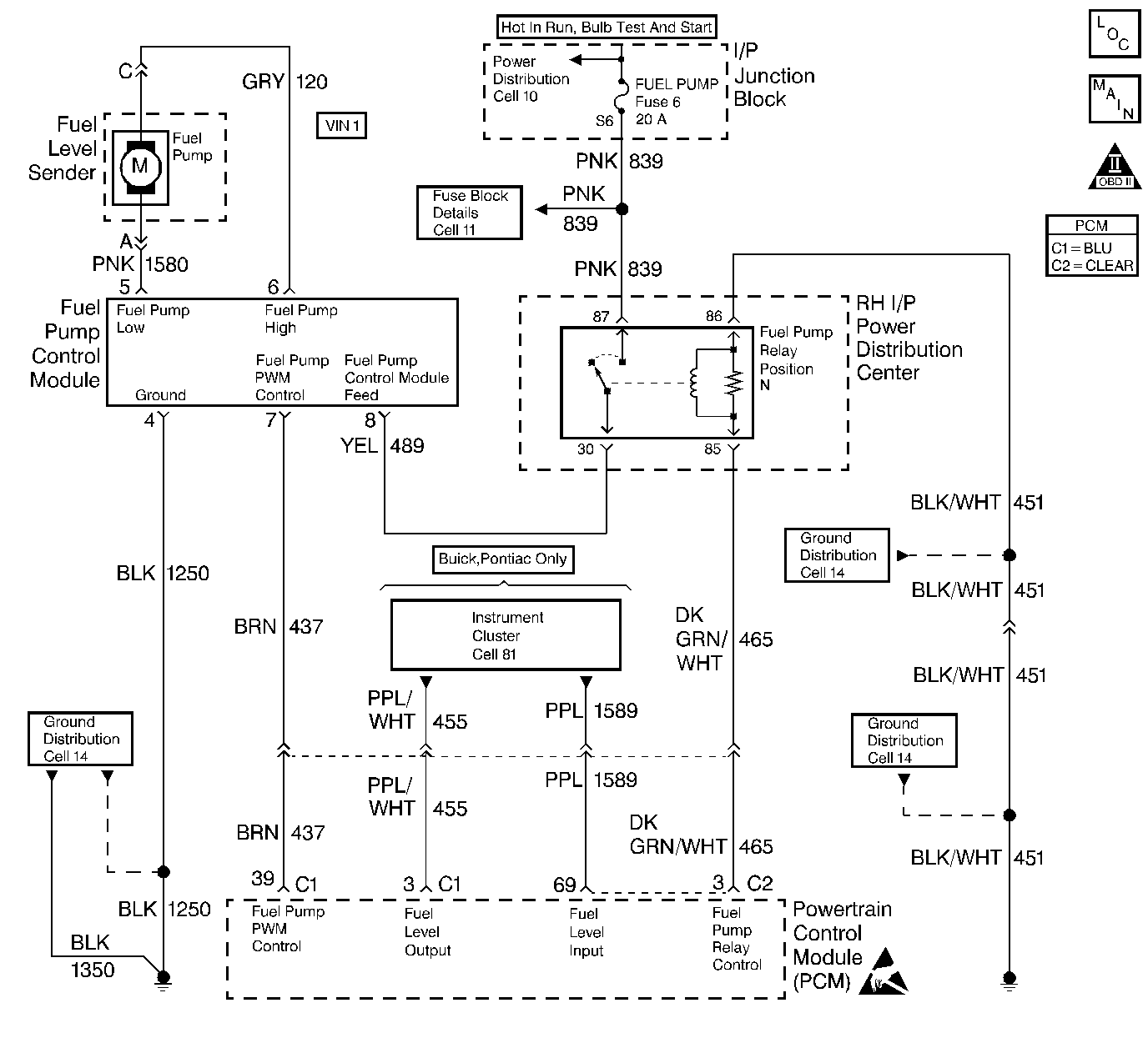 Output Driver Modules (ODMs) are used by the PCM to turn on many of the current-driven devices that are needed to control various engine and Transaxle functions. Each ODM is capable of controlling up to 7 separate outputs by applying ground to the device which the PCM is commanding ON. Unlike the Quad Driver Modules (QDMs) used in prior model years, ODMs have the capability of diagnosing each output circuit individually. DTC P1667 set indicates an improper voltage level has been detected on ODM A output 3, which controls the Fuel Pump Speed Control PWM signal to the fuel pump control module.