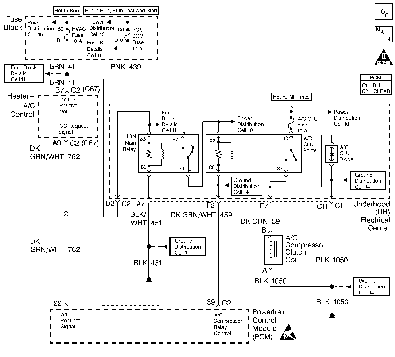 | • | An improper voltage level is detected on the output circuit which controls the A/C relay. |