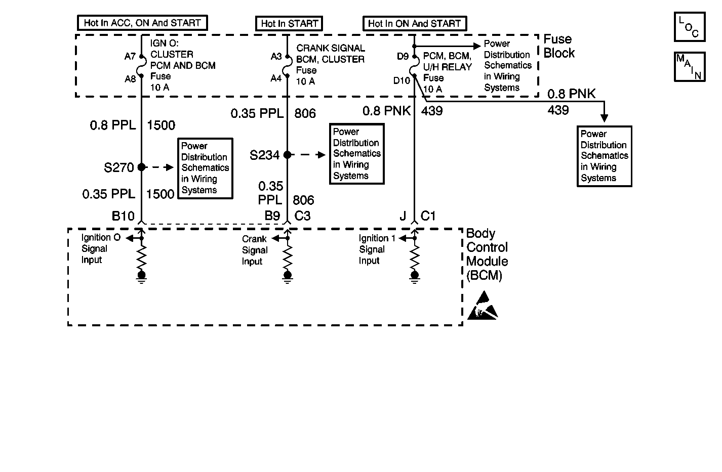 The BCM receives three voltage inputs. The BCM receives voltage from the (IGN 0, CLUSTER, PCM, and BCM fuse) circuit at all times except when the ignition switch is off. The BCM receives voltage from the (PCM, the BCM, and the U/H Relay fuse) circuit when the ignition switch is in the ON or START position. The BCM receives voltage from the (CRANK SIGNAL, BCM, CLUSTER) fuse through the crank circuit when the ignition switch is in the start position.