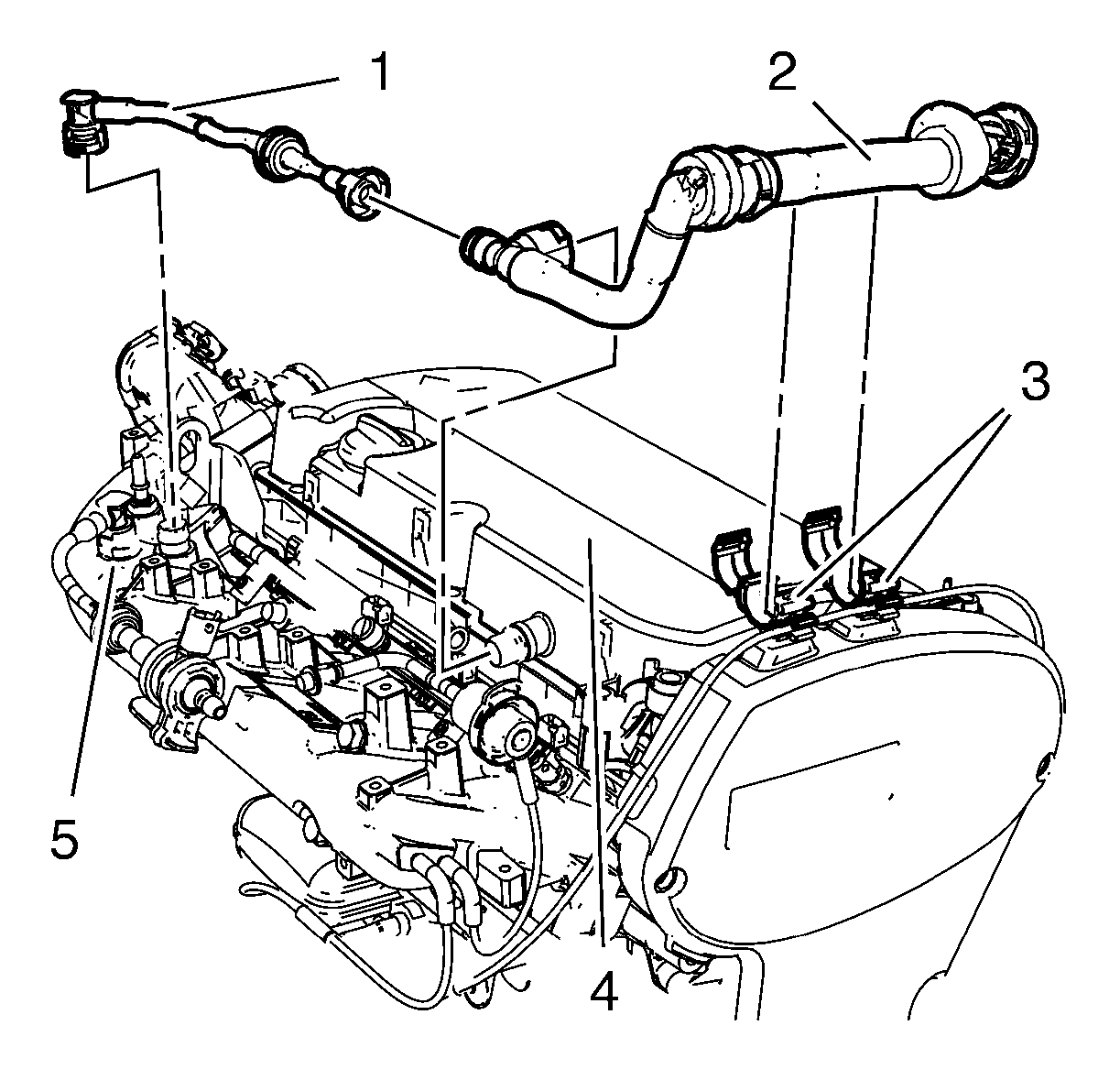 - Install the positive crankcase ventilation pipe (1, 2) to the camshaft cover (4) and intake manifold (5).