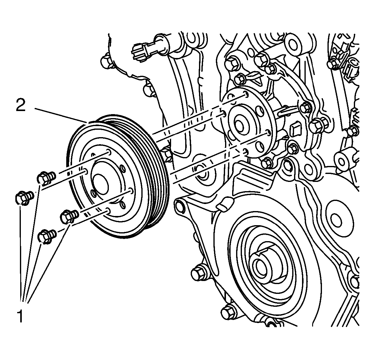 (1) onto the water pump pulley and tighten the 4 water pump pulley bolts to