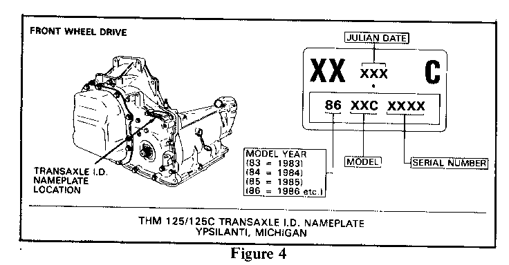 BUICK NOTE: THIS BULLETIN SUPERSEDES 86-7125-5A WHICH WAS PUBLISHED WITHOUT TRANSAXLE MODEL PNC. PLEASE DISCARD BULLETIN 86-7125-5A AND REPLACE IT WITH THIS ONE. A 1986 THM 125C TRANSAXLE MAY EXPERIENCE A HARSH 1-2 UPSHIFT WHEN HOT DURING MEDIUM TO HARD THROTTLE ACCELERATION. REFER TO FIGURE 1 FOR TRANSAXLE IDENTIFICATION INFORMATION AND TO CHART BELOW FOR MODELS. WHEN SERVICING THIS CONDITION ON A THM 125C TRANSAXLE BUILT BETWEEN THE SERIAL NUMBERS LISTED BELOW, REMOVE THE SPACER PLATE AND MEASURE THE DIAMETER OF THE 1-2 ACCUMULATOR FEEDBACK ORIFICE (REFER TO FIGURE 2 FOR LOCATION). IF THE HOLE IS 1.02MM (0.040"), REPLACE THE SPACER PLATE WITH THE INDICATED SERVICE SPACER PLATE, WHICH HAS A LARGER (3.18 MM/0.125") 1-2 ACCUMULATOR FEEDBACK ORIFICE. SERIAL NUMBER SERIAL NUMBER SPACER PLATE MODEL START END PART NUMBER BAC 4482 6468 8660575 BDC 2137 2289 8660575 BPC 52519 57074 8660575 CAC 8054 8280 8660581 CBC 127346 128483 8660581 CCC 1914 2059 8660581 CMC 1283 11286 8660581 HXC 4215 4215 8660581 PHC 10949 12483 8660552 PKC 13015 14585 8660552 PNC 147386 162750 8660552 PRC 35775 39656 8660552 JSC 5642 6461 8660579 REFER TO THE APPROPRIATE SERVICE MANUAL FOR REMOVAL AND INSTALLATION PROCEDURES. REFER TO ILLUSTRATION ON PUBLISHED BULLETIN.