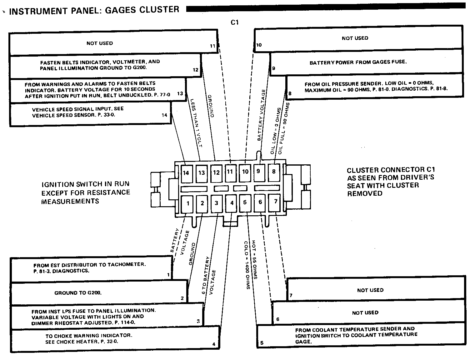The tables on the following pages give the voltages or resistances you will find at connectors Cl and C2 with the cluster removed.