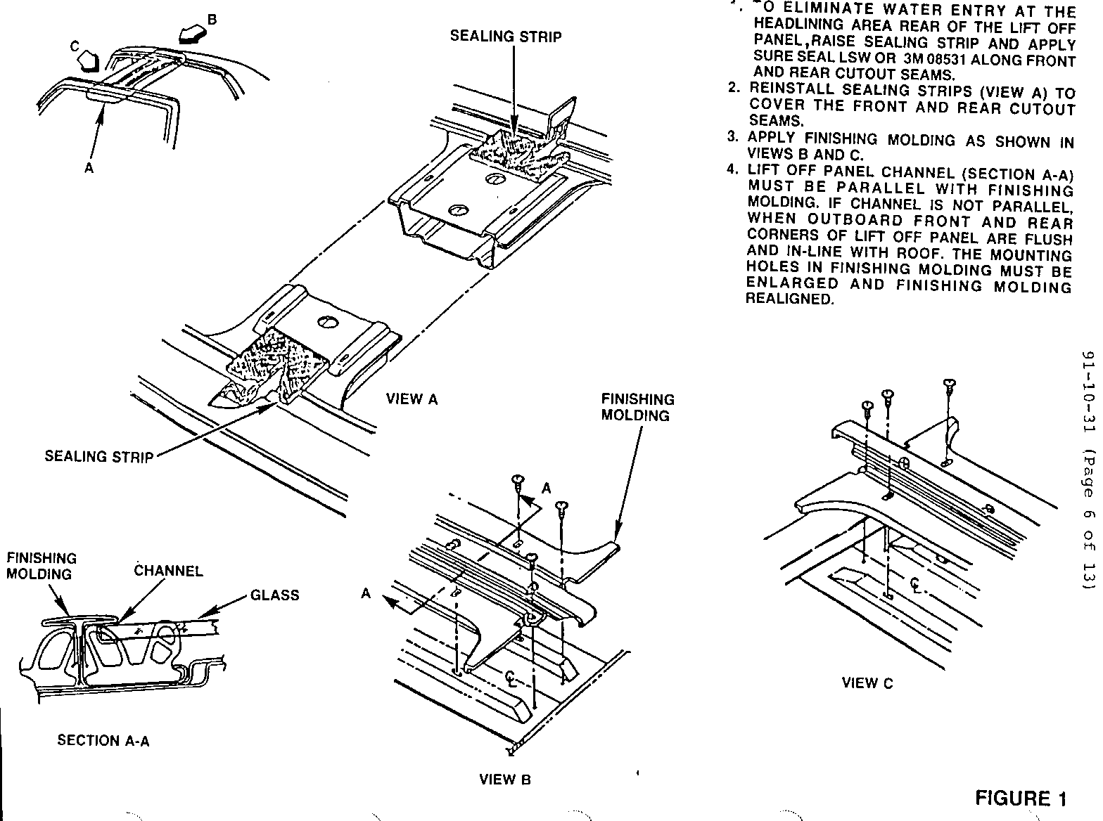 1. TO ELIMINATE WATER ENTRY AT THE HEADLINING AREA REAR OF THE LIFT OFF PANEL, RAISE SEALING STRIP AND APPLY SURE SEAL LSW OR 3M 08531 ALONG FRONT AND REAR CUTOUT SEAMS.
