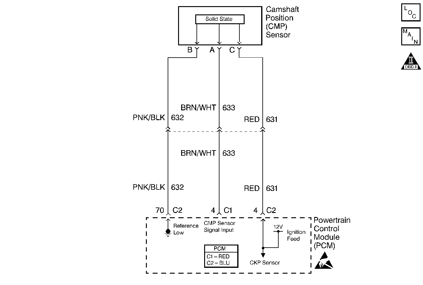 The Camshaft Position sensor is mounted through the top of the engine block at the rear of the valley cover. The CMP sensor works in conjunction with a 1X reluctor wheel on the camshaft. The reluctor wheel is inside the engine immediately in front of the rear cam bearing. The PCM provides a 12 volt power supply to the CMP sensor as well as a ground and a signal circuit.