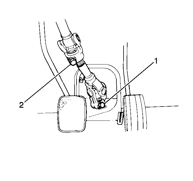 3. Align the flat section of the steering shaft lower spline (1) with the pinch bolt hole in the steering shaft coupling (2).