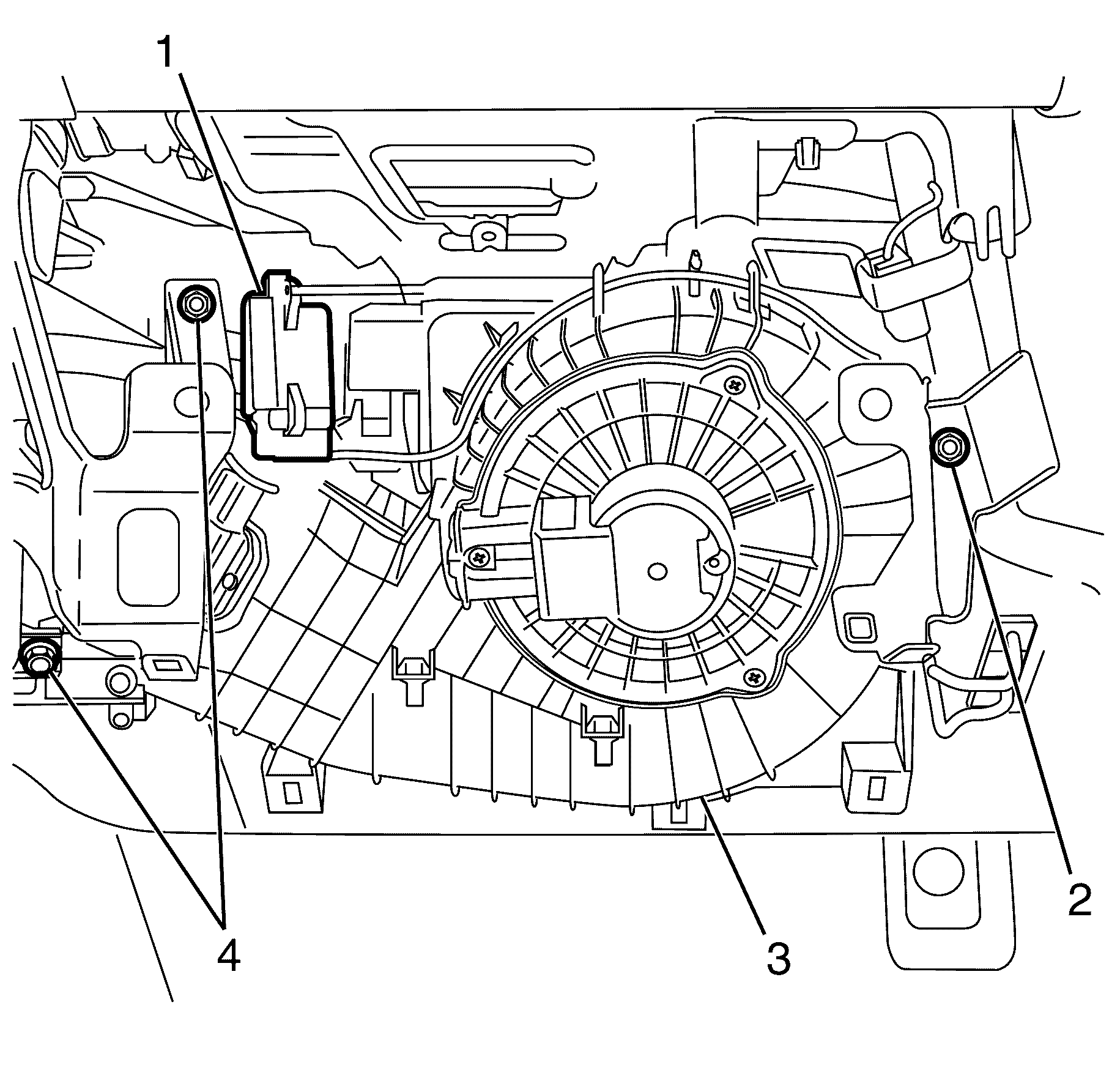 - Remove the HVAC support brace (1) from the HVAC module assembly (4).