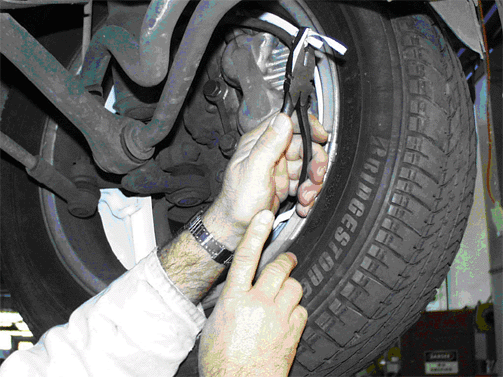 | | For later 2008 and beyond model years, the brake disc protection cover is NOT tied to the brake hose. You can simply rotate the wheel while at the same time pulling the torn end of the cover away from the brake disc and wheel. |