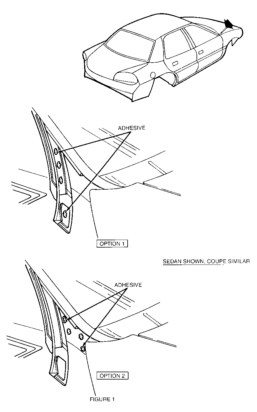 Correction: Apply a suitable adhesive such as, 3M black Super Weatherstrip Adhesive, P/N 08008, or equivalent in the areas shown in Figure 1. Press weatherstrip in place and remove excess weatherstrip adhesive.