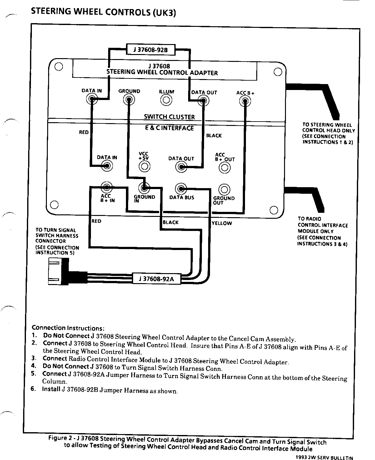 A new essential tool (J37608-92) was released in November of 1992 for all Pontiac dealerships. The new tool consists of three individual jumper harnesses that work in conjunction with the Steering Wheel Control Adapter (J37608). The tools mentioned above are used in diagnosing Optical Steering Wheel Control (SWC) systems. They are not used for Analog SWC systems.