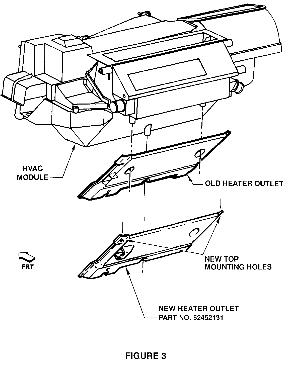 To address this condition use the Service Manual Procedure on the removal of the heater core cover. If the core is out of position as shown in Figure 2 reposition the core and install the heater core cover. If the HVAC module has the old heater outlet, as shown in Figure 3, it would be advisable to install the new heater outlet.