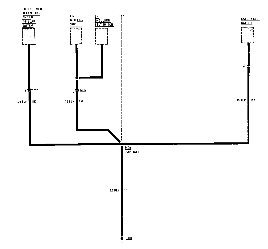 C310 (9 cavities) ..................At base of LH center pillar C311 (9 cavities) ..................At base of RH center pillar C401 (3 cavities) ..................Center of end panel.............201-6-B C402 (2 cavities) ..................LH side of cargo compartment....201-7-A C405 (2 cavities) ................. LH side of cargo compartment C406 (2 cavities) (Notchback).......Top of RH rear roof pillar C406 (2 cavities) (Hatchback).......RH side of cargo compartment GROUNDS G101................................Rear of engine, near Starter Solenoid G102................................Top RH side of engine, on intake manifold G103................................Top RH side of engine, on cylinder head G104................................LH front corner of engine.......201-0-A compartment G105................................Behind LH side of I/P, on.......201-4-A clutch pedal support G110................................LH front corner of engine.......201-0-A compartment G200................................Behind LH side of I/P,..........201-5-A behind Fuse Block G300................................Below console, at base of.......201-6-A gear shift lever G400................................Center of end panel.............201-6-B G402 (Notchback)....................At LH rear quarter panel G402 (Hatchback)....................At LH side of glass, GROMMETS underside of hatch P100................................LH front of dash................201-0-A P101................................Behind RH side of I/P...........201-3-D P200................................Lower LH front of dash..........201-0-A P400................................Center of end panel.............201-6-B P401................................Below RH side of rear seat......201-6-A P402................................Top of LH quarter panel.........201-7-A SPLICES S102................................TBI harness, behind.............201-3-D RH side of I/P S103................................Front harness, LH front of......201-0-A engine compartment S104................................Front harness, below RH.........201-0-A side of radiator S105................................TBI harness, behind RH..........201-3-D side of I/P S106................................Front harness, below............201-0-A RH side of radiator S107................................Front harness, lower RH........ 201-0-A front of engine compartment S108................................Front harness, LH front of......201-0-A engine compartment S110................................Front harness, front of.........201-0-A engine compartment S111................................TBI harness, behind RH..........201-3-D side of I/P S113................................TBI harness, behind RH..........201-3-D side of I/P