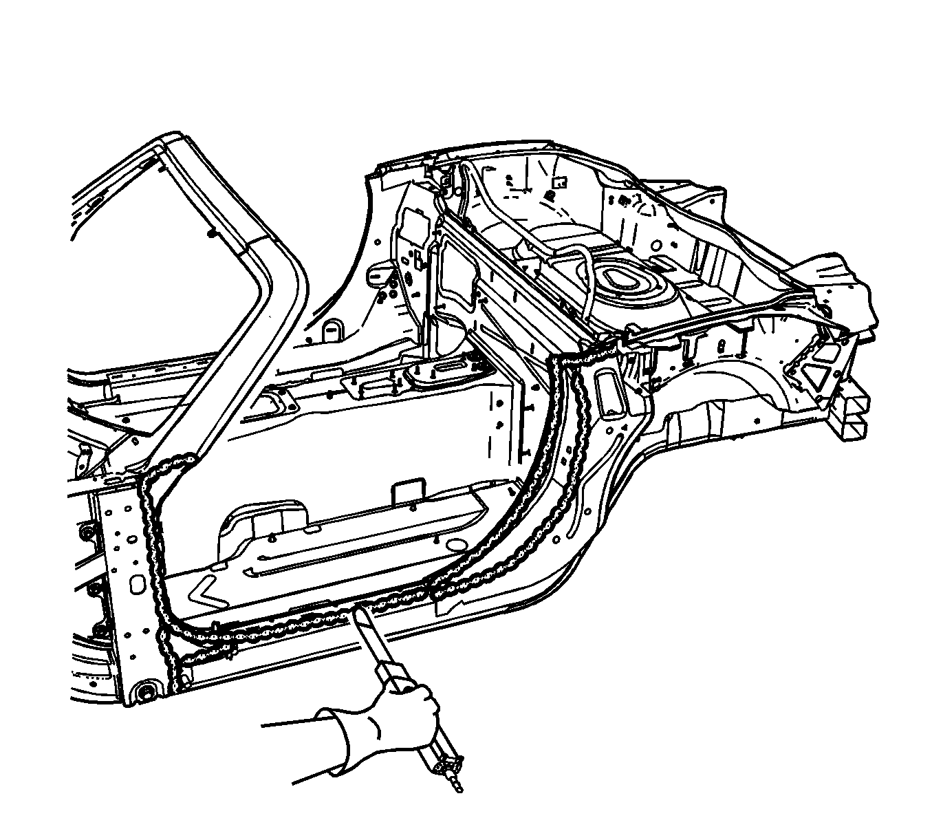 - Use a urethane adhesive kit or equivalent to apply a consistent bead of urethane adhesive 20 mm (3/4 in) in diameter to the mating surfaces of the quarter panel, the side structure, and the frame rail, and to all areas that were originally