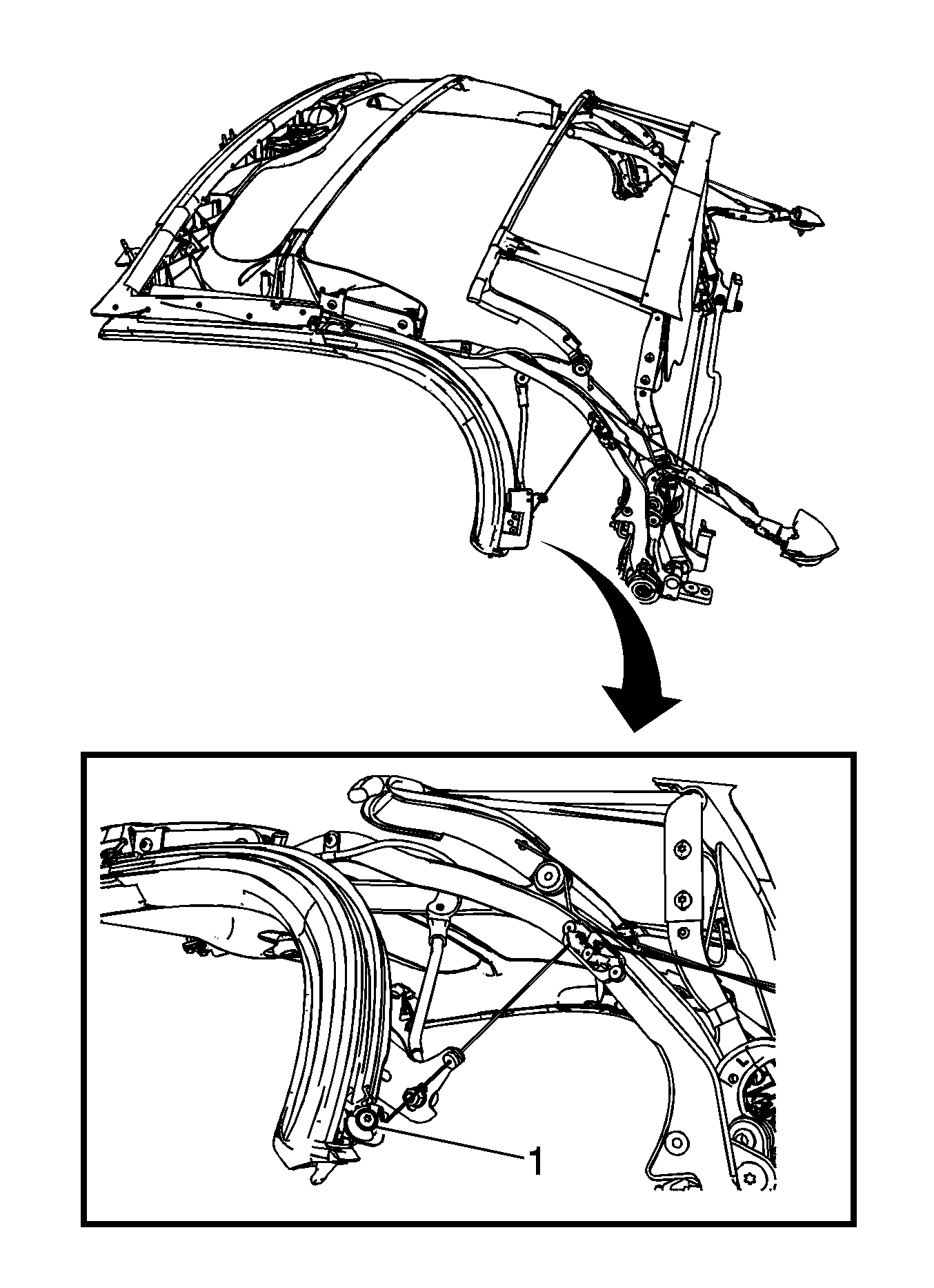 - Install the bracket (1) for the forward attachment point of the folding top cover side inner tension cable.