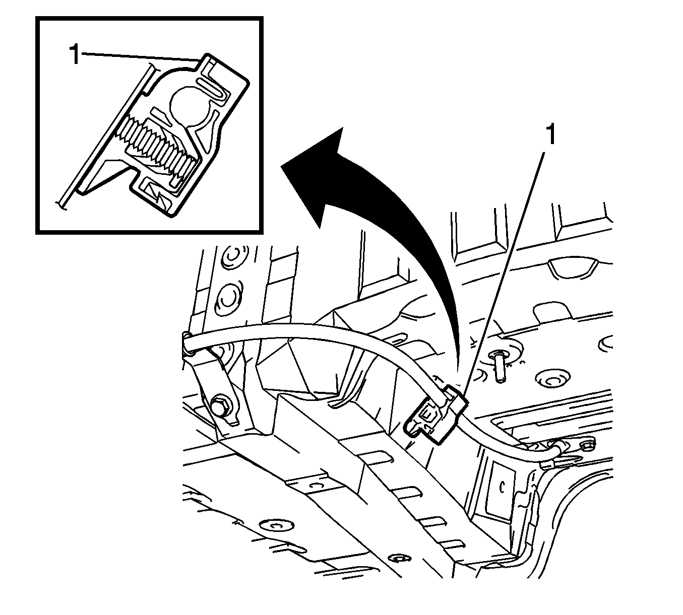 - Remove the bolt (1) that retains the rear park brake cable to the body.