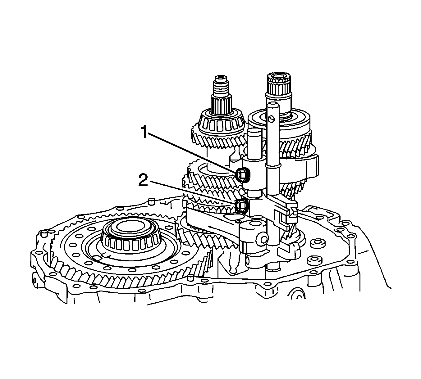- Remove the shift fork set bolt (1) and shift head set bolt (2) from the No. 2 gear shift fork and No. 1 gear shift head.
