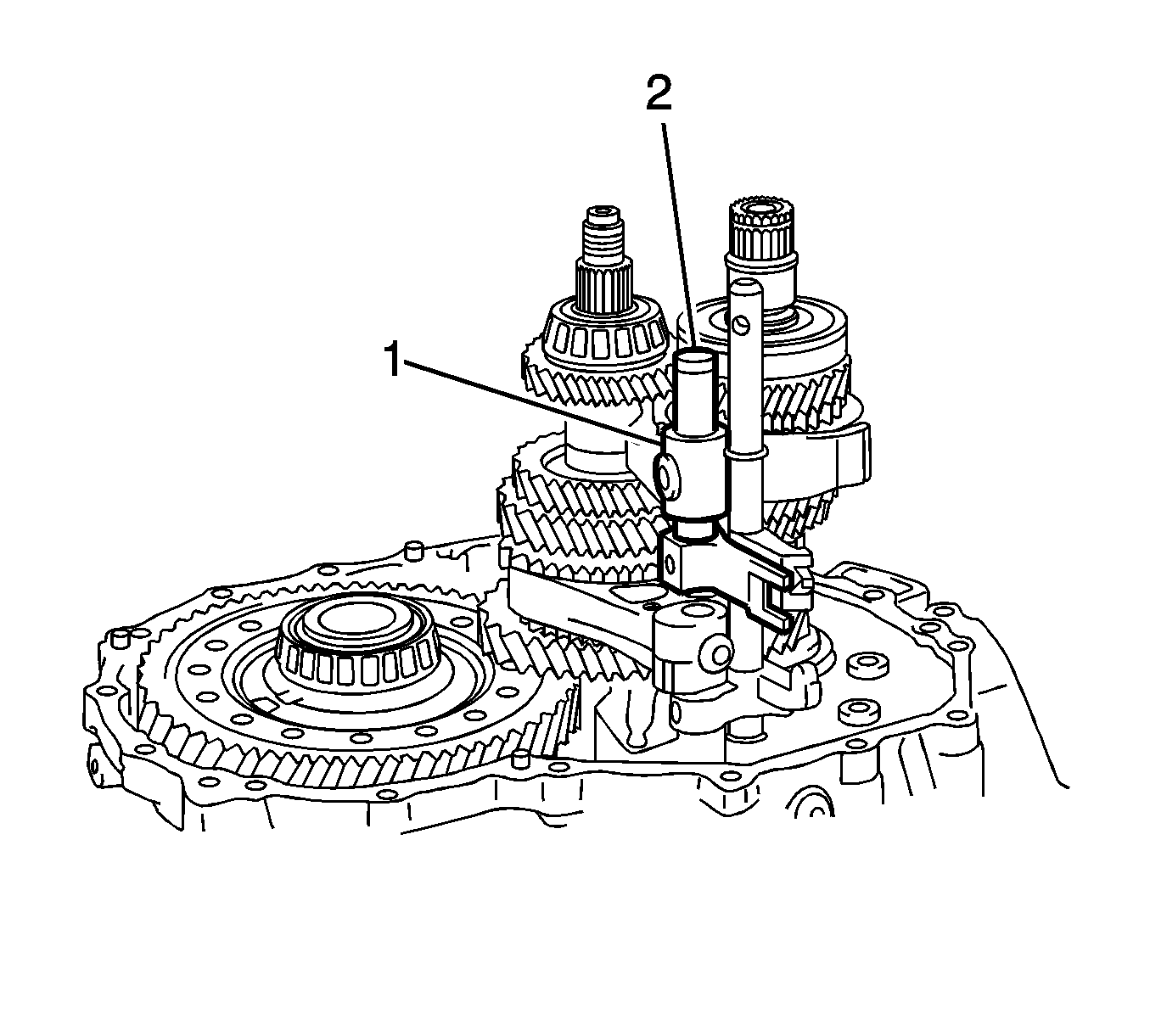 - Remove the No. 2 gear shift fork (2) shaft and No. 1 gear shift head (1) from the manual transaxle case.