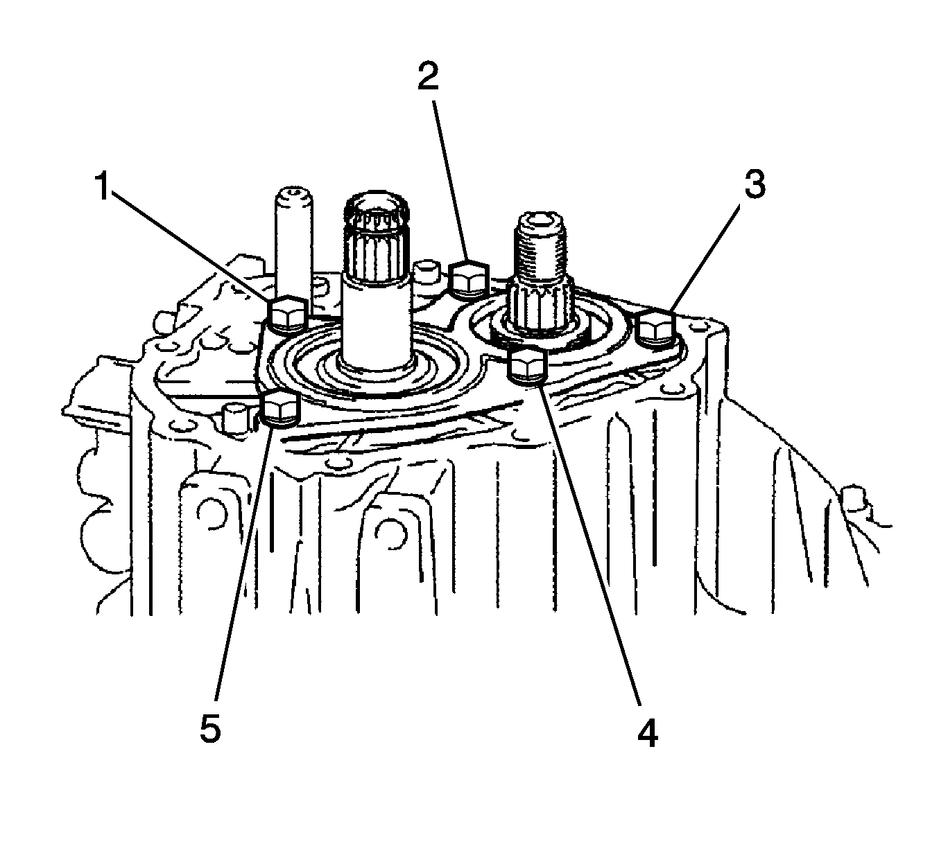 - Remove the bolts (1-5) and rear bearing retainer from the manual transmission case.
